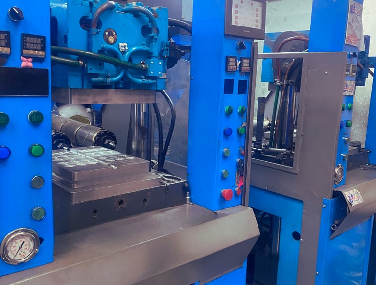 Inyección para terceros Utilizamos nuestra máquina de diseño propio para producir suelas y componentes con estándares de calidad exigentes, adaptados a distintos moldes y materiales.